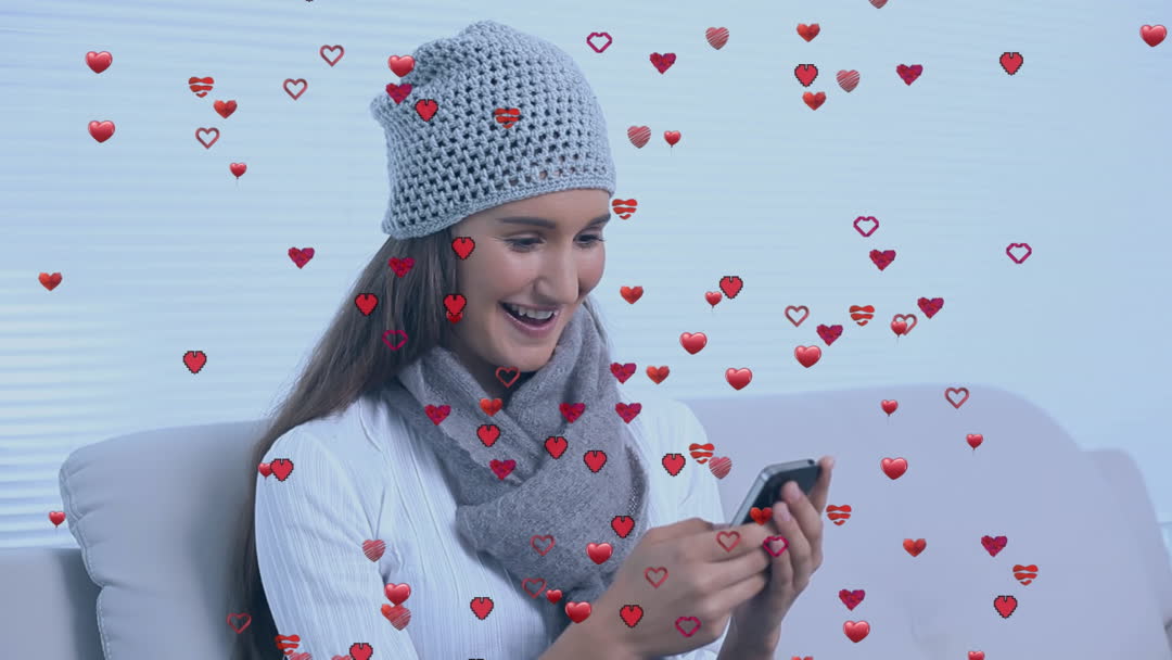 Woman using smartphone with heart icons appearing around her. She is wearing knitted hat and scarf, suggesting cold season usage. This video symbolizes engagement with social media or receiving positive feedback online. Useful for web communication promotions, every day lifestyle blogs, and social networking content to emphasize human connection through technology.
