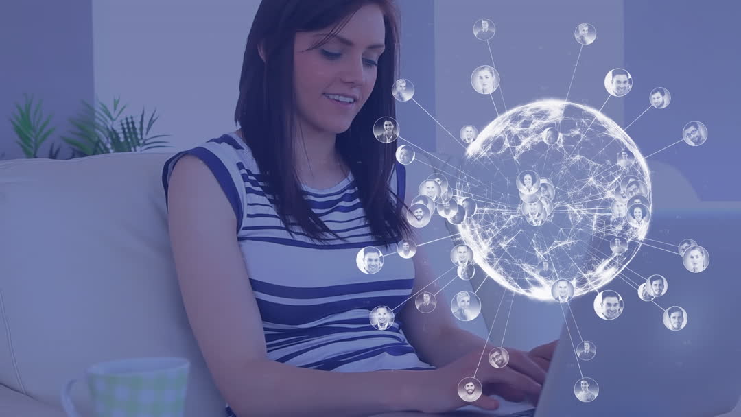 This portrayal of a woman engaging with a global network while working on her laptop emphasizes modern communication and technology concepts. Ideal for representing remote work, digital networking, or online business solutions. Suitable for use in technology blogs, business presentations, or corporate materials highlighting remote connectivity.