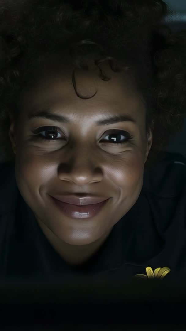AI Generated Video. Vertical video capturing closeup portrait of woman smiling, screen glow reflecting in eyes. Underlit, low light composition creating intimate mood and warm skin tones. Yellow emblem on shoulder adding subtle pop of color and brandable detail. Suited for social media stories, mobile app ads, onboarding sequences, customer testimonial clips, dating app creatives, nighttime lifestyle features. Editing suggestions: crop tight for eyeline emphasis, boost contrast and highlights on eyes, add subtle vignette, include lower third caption or logo. Helping mobile-first campaigns and vertical reels convey friendly, engaging late-night moment.