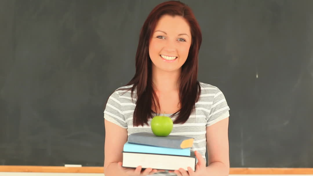 - Smiling Woman Holding Books and Apple in Classroom Setting