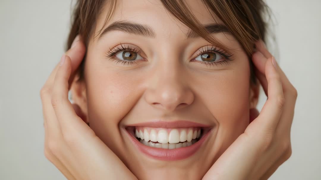 AI Generated Video. Featuring closeup of smiling adult female model holding hands to face while camera starts recording, showing bright teeth and radiant skin. Capturing authentic joyful expression and confident eye contact for use in marketing, dental, beauty, lifestyle projects. Working well for social media reels, app promos, website hero banners, testimonial sequences, onboarding videos. Allowing cropping into square, vertical, landscape formats for platform-specific needs. Providing clean neutral background and soft studio lighting for easy color grading and text overlay. Suggesting use in dental care campaigns, teeth whitening ads, smile clinics, cosmetic dentistry, personal branding, influencer content. Delivering high-resolution frame suited for thumbnail, banner, cutaway shot in longer video. Model release recommended for commercial use.