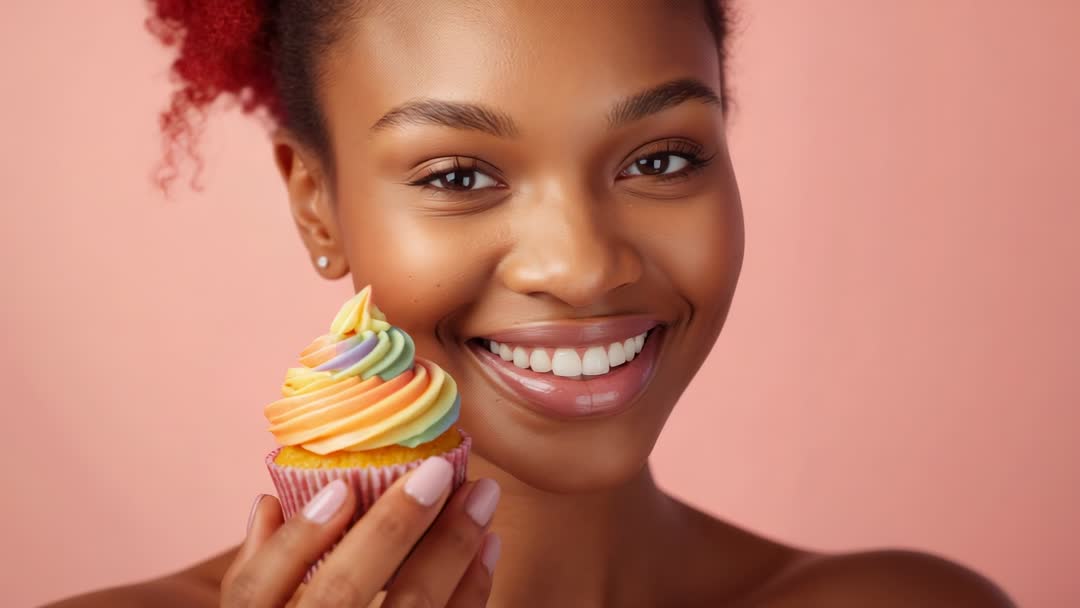 AI Generated Video. Video showing smiling woman holding rainbow-frosted cupcake close to face against pastel pink backdrop. Clip featuring slow camera push, natural expression, and tight framing, capturing frosting texture, manicured nails, glossy lips, and bright teeth. Ideal for bakery social media, dessert advertising, lifestyle campaigns, recipe intros, cosmetic or dental promotions, greeting cards, and celebration graphics. Suiting homepage banners, product packaging, Instagram reels, YouTube thumbnails, and email marketing. Colorful composition working well with upbeat copy and pastel brand palettes. Clip delivering friendly, joyful mood and strong visual focus for conversion-driven creative.