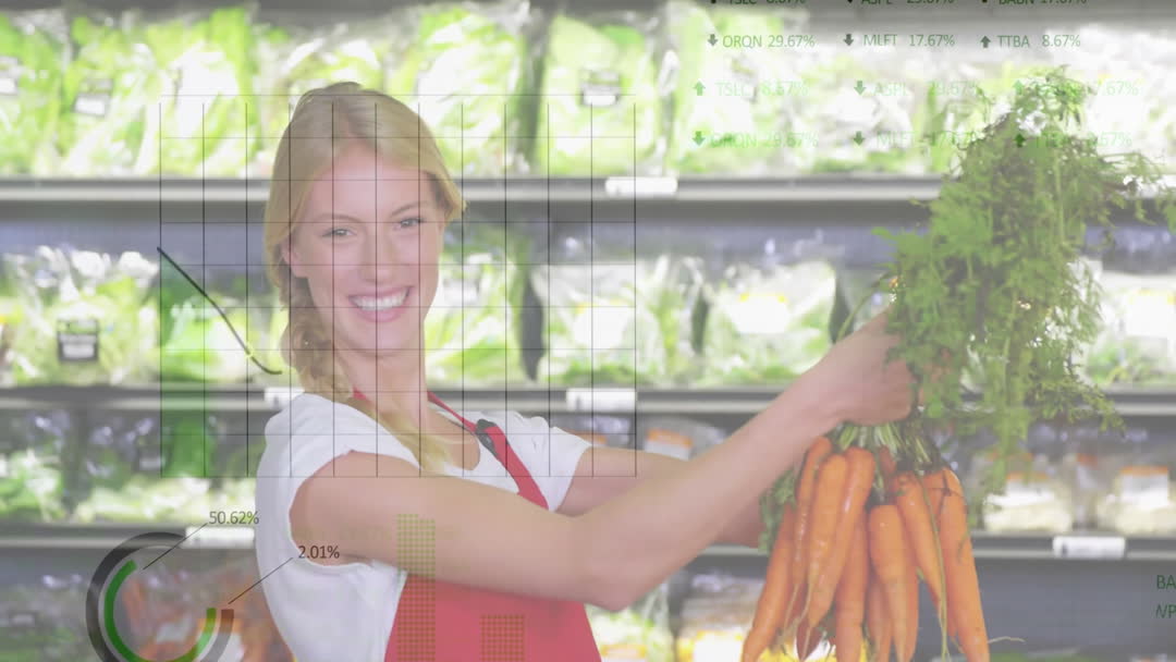 Smiling Woman in Grocer with Carrots and Data Analytics Overlay Video