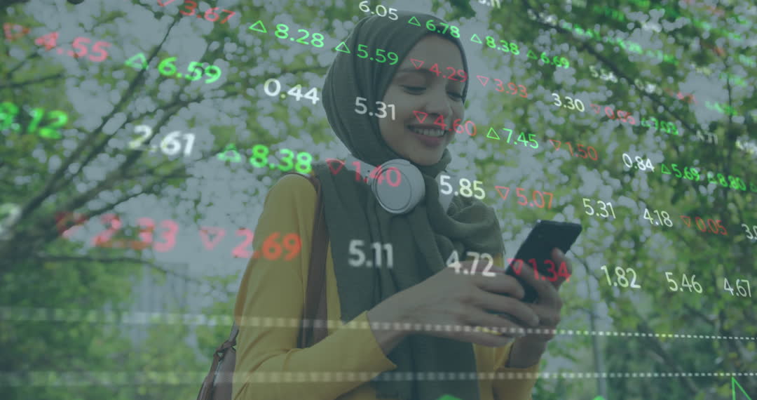 - Smiling Woman in Hijab Using Smartphone with Financial Data Overlay