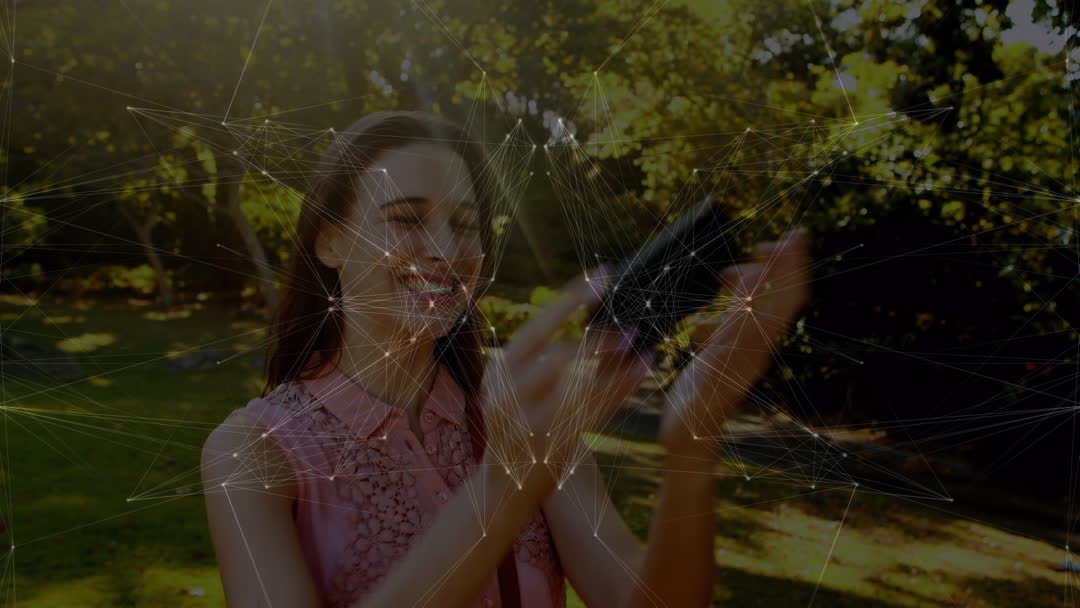 A woman smiling while taking a selfie in a lush summer park with a digital network graphic overlay representing global connectivity. Perfect for illustrating digital communication concepts or modern technology applications.