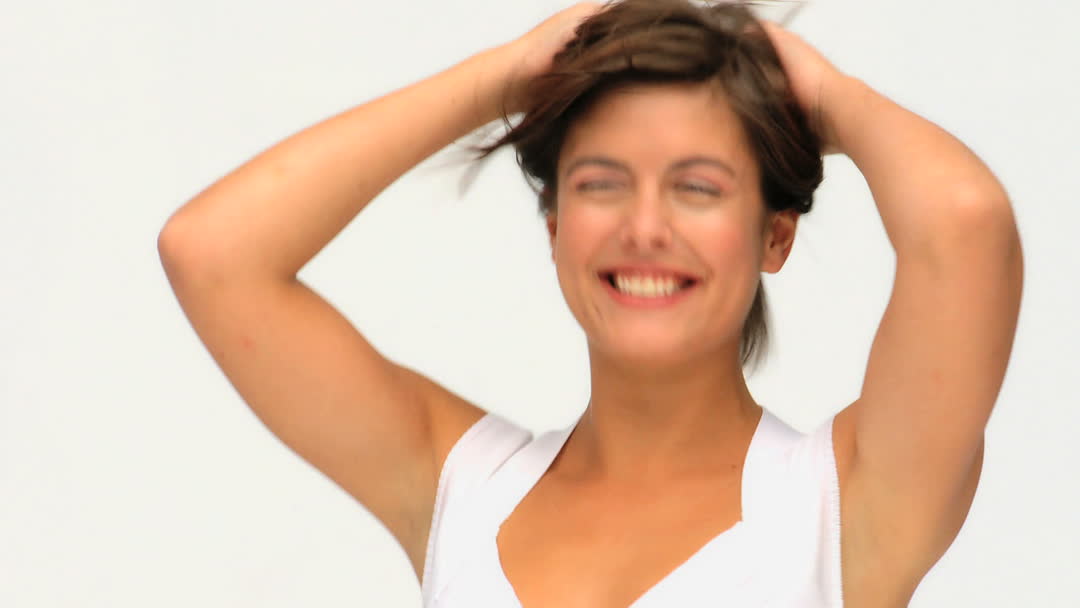 Young woman with brown hair happily posing with hands in hair and smiling. Ideal for lifestyle blogs, positive mental health articles, hair care products, and advertising campaigns that focus on joy and simplicity.