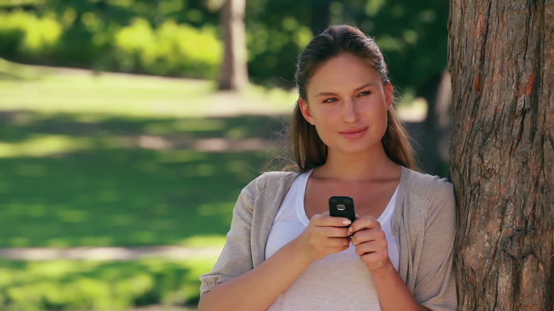 - Smiling Woman Leaning on Tree in Park with Mobile Phone