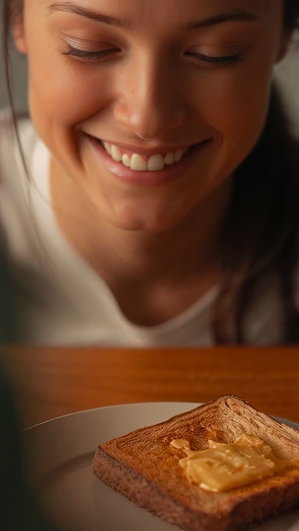 AI Generated Video. Showing close-up of smiling woman leaning over buttered toast on plate, anticipating bite. Featuring warm soft lighting and shallow depth of field, creating intimate, cozy mood. Working well for social media stories, vertical ads, recipe reels, breakfast branding, dairy or bakery campaigns, food blogs, nutrition and lifestyle content. Leaving room in frame for headline, logo or caption, making clip ready for quick edit and caption overlays. Model wearing white top and natural makeup, conveying wholesome, relatable tone. Color palette leaning warm browns and golden highlights, matching food and wooden table surfaces. Ideal for thumbnail, opener or cutaway shots in morning routine videos and food tutorials.