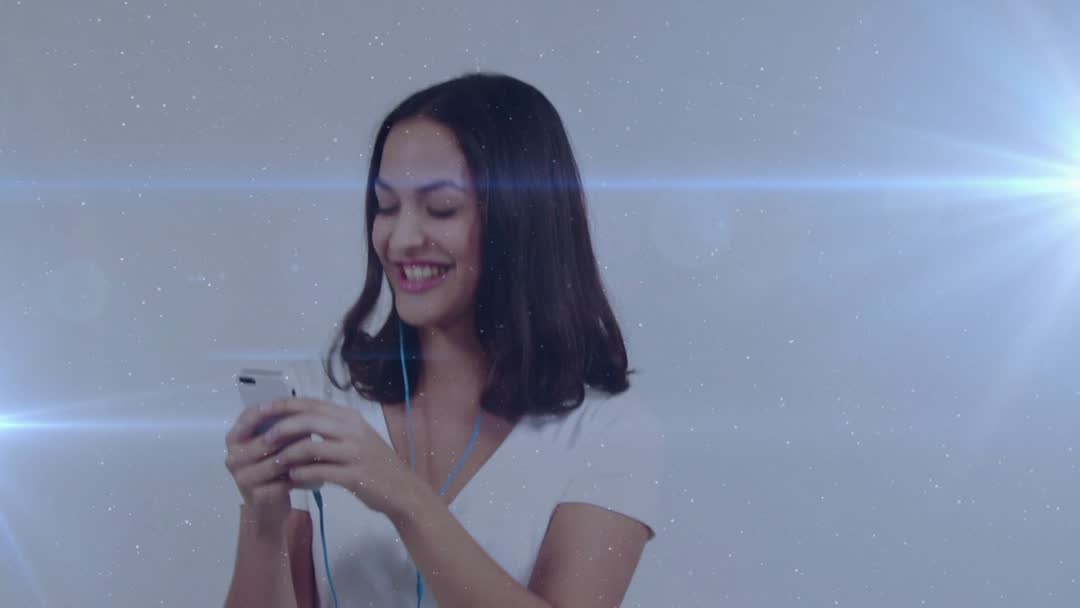 Smiling woman listening to music on smartphone while adjusting turquoise earbuds, presenting natural, relaxed performance. Lens flare and floating particles creating cinematic, dreamy atmosphere. Clean white background keeping focus on subject and turquoise cable adding pop of color. Close-up composition highlighting genuine smile and natural gestures, fitting lifestyle, technology, or audio campaigns. Suggesting uses: background loop for music app landing page, hero clip for wireless earbud advertising, social media promo for streaming service, tutorial for device setup, thumbnail for playlist or podcast content. Providing versatile footage for editors needing upbeat, relatable human moment with modern tech.