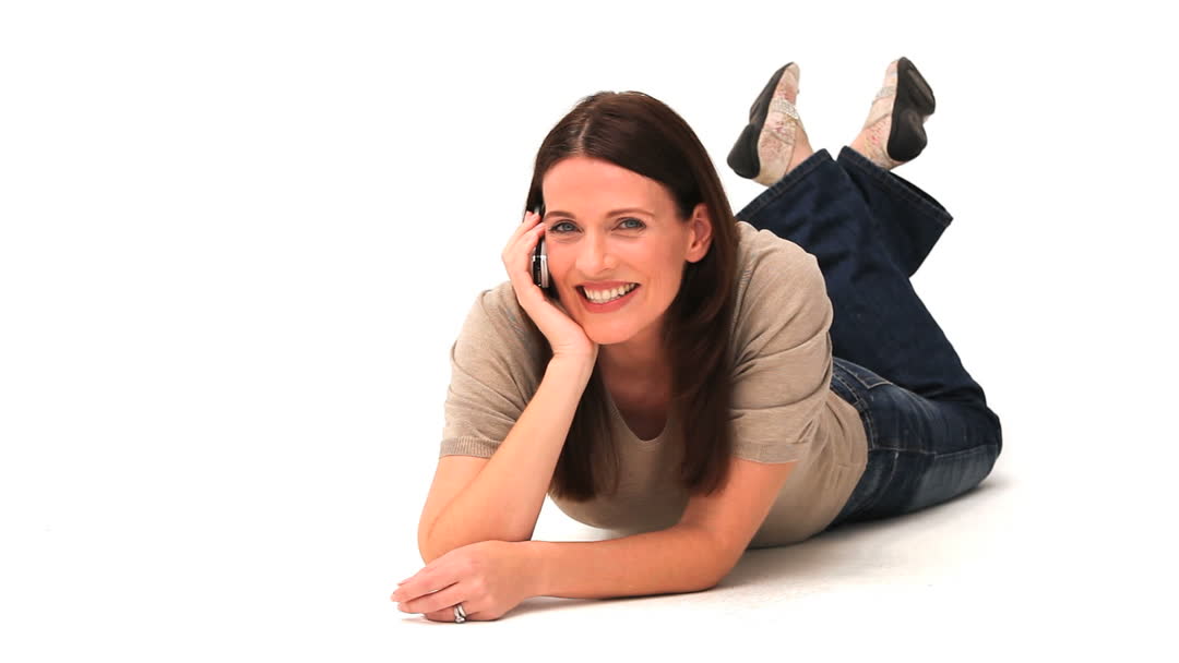 - Smiling Woman Lying on Floor Talking on Phone