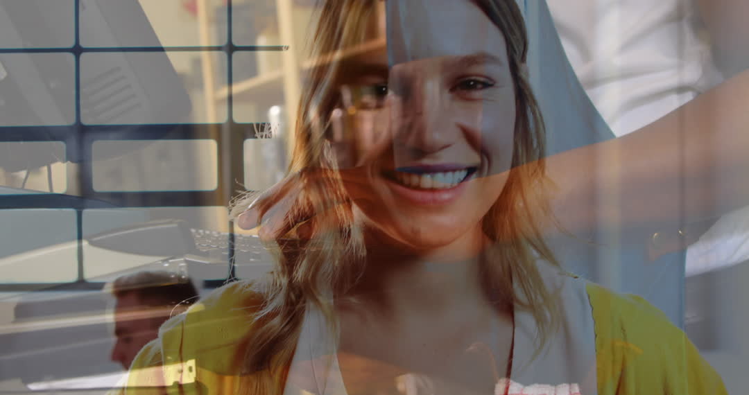 Smiling Woman Overlays Business Technology Imagery Fusion Video