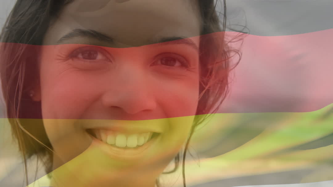 This video features a close-up of a woman smiling with the national flag of Germany overlaid. Symbolizing cultural diversity and pride, the visual combines personal identity with patriotism. Ideal for use in themes highlighting multiculturalism, national celebrations, reports on ethnic diversity, or discussions about personal identity and heritage.