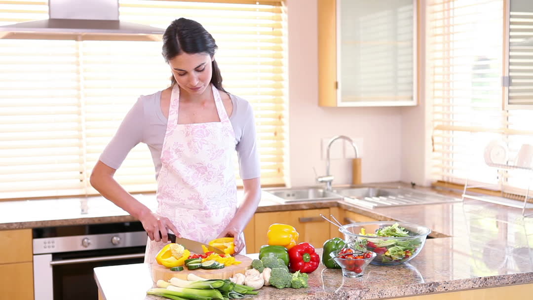 A woman wearing an apron cuts fresh vegetables in a bright kitchen. The scene includes various vegetables on a wooden counter, highlighting healthy cooking and meal preparation. Ideal for content focusing on healthy eating habits, home cooking, kitchen design, culinary blogs, or advertisements promoting kitchenware or healthy living.