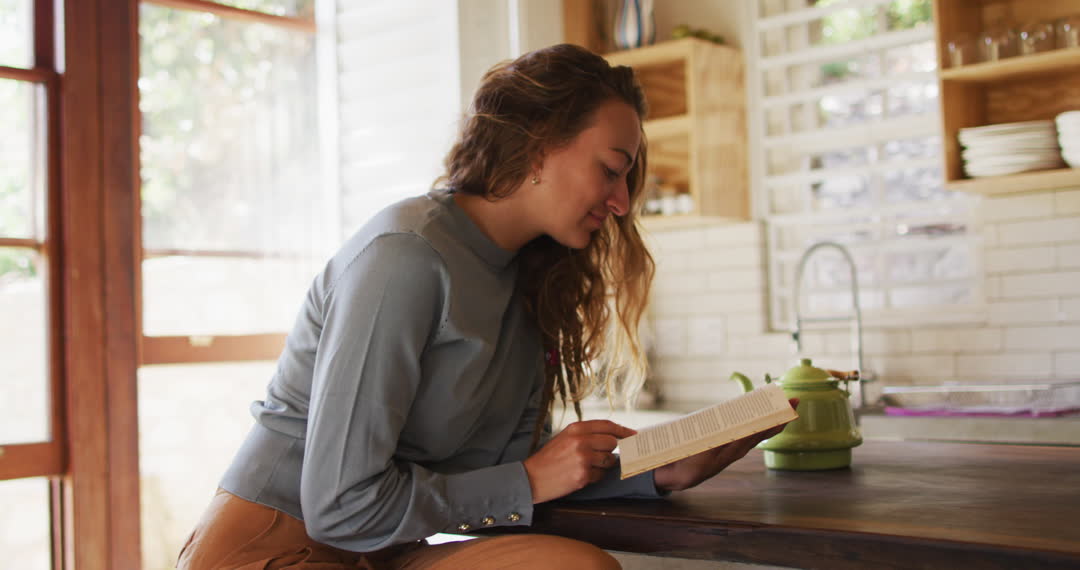 Young woman enjoying reading a book while sitting at a rustic kitchen counter. Sunlight streams through windows, creating a warm and inviting atmosphere. Ideal for promoting literature, lifestyle blogs, or depicting serene domestic settings. Can be used to highlight themes of relaxation, mindfulness, and home life charm.