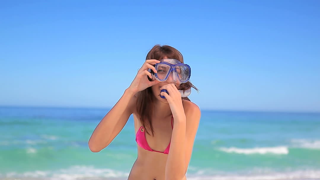 - Smiling Woman Readying for Snorkeling on Sunny Beach