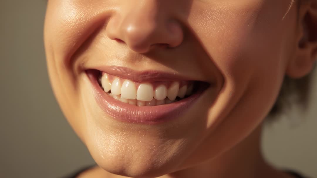 AI Generated Image. Closeup video clip showing smiling young woman revealing upper teeth and dimples as camera starts recording. Warm soft light sculpting skin texture and glossy lips. Subtle head movement and natural laughter lines creating authentic, inviting mood. Ideal for dental care, cosmetic dentistry, teeth whitening, toothpaste campaigns, orthodontics marketing, beauty and skincare promotions, social media reels, lifestyle vlogs, and healthcare communications. Use for banner hero clips, background B-roll, testimonial sequences, before-and-after montages, and hero shots for clinic websites. Recommend using slow zoom or gentle crossfade to emphasize warmth. Color grade to warm tones to enhance inviting mood. Provide version with subtitles or overlay text for campaign messaging and product callouts.