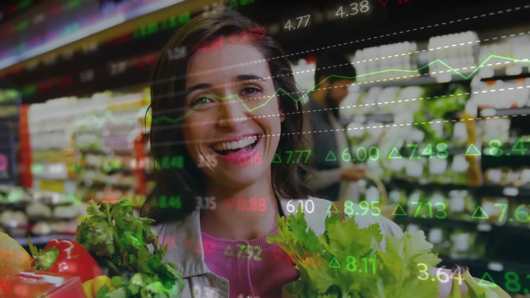Smiling woman shopping produce with market data overlay and rising price graphs Video