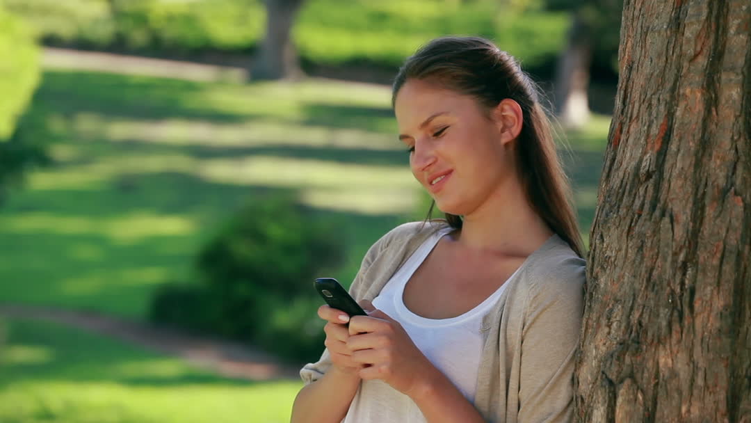 - Smiling Woman Texting Outdoors by Tree in Sunlit Park