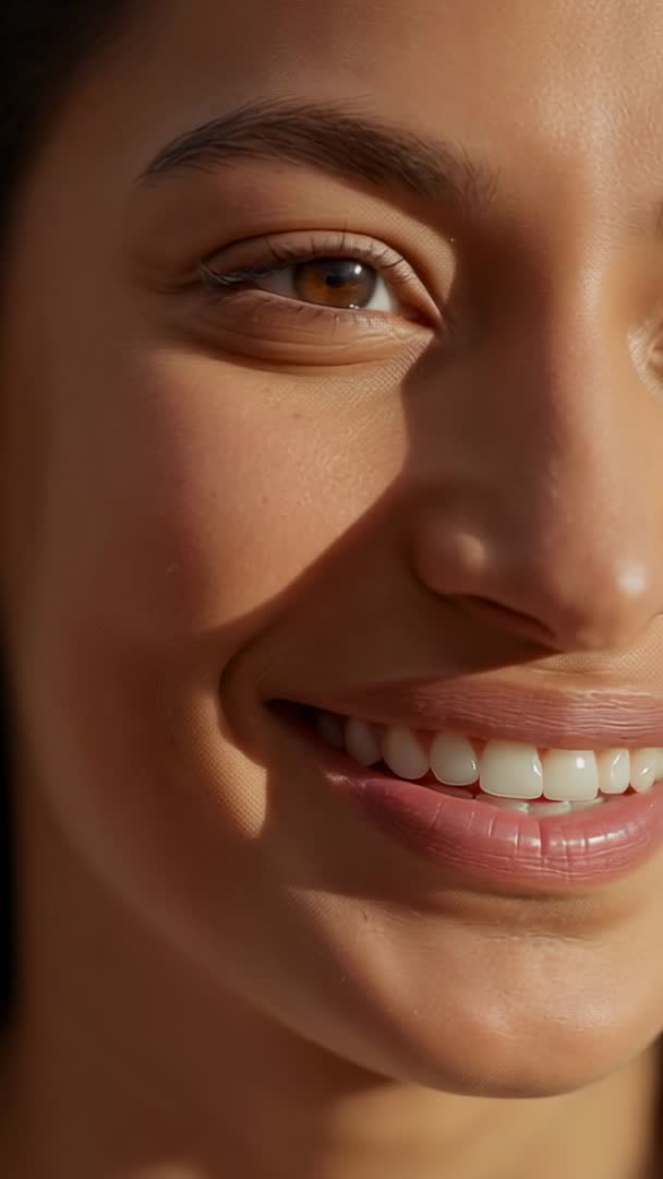 AI Generated Video. Showing closeup vertical video of smiling woman turning head and widening smile in warm golden directional light. Capturing natural skin texture, bright teeth, brown eye sparkle, subtle shadows and genuine expression. Working well for social media stories and reels, influencer content, beauty and skincare campaigns, dental and orthodontic promotions, wellness and mental health projects, testimonial clips and hero banners for websites. Suggesting slow motion for emphasis, looping trim for repeating smile, warm color grade for cohesive brand look, soft vignette to enhance focus on face. Leaving negative space near top right or lower left for logo, headline text or call to action. Mood conveying warmth, trustworthiness, youthful confidence and authentic joy.