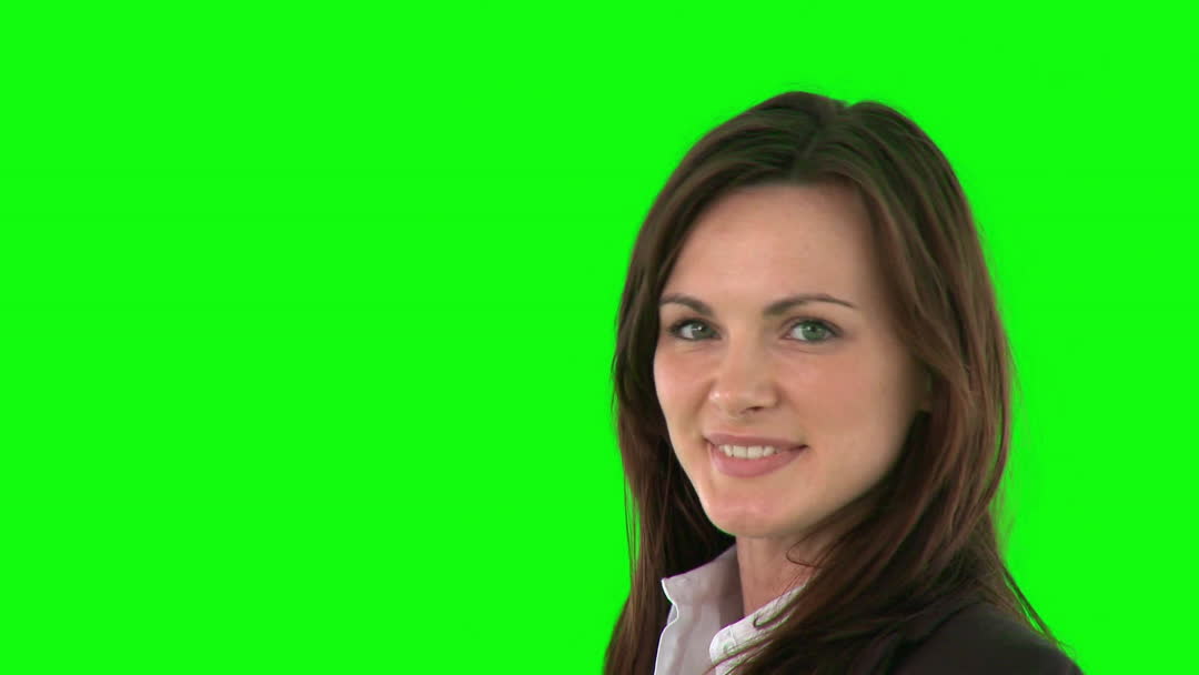 Businesswoman smiling while turning her head against a bright green screen background. Ideal for projects involving background replacement, professional presentations, and branding materials requiring corporate videory.