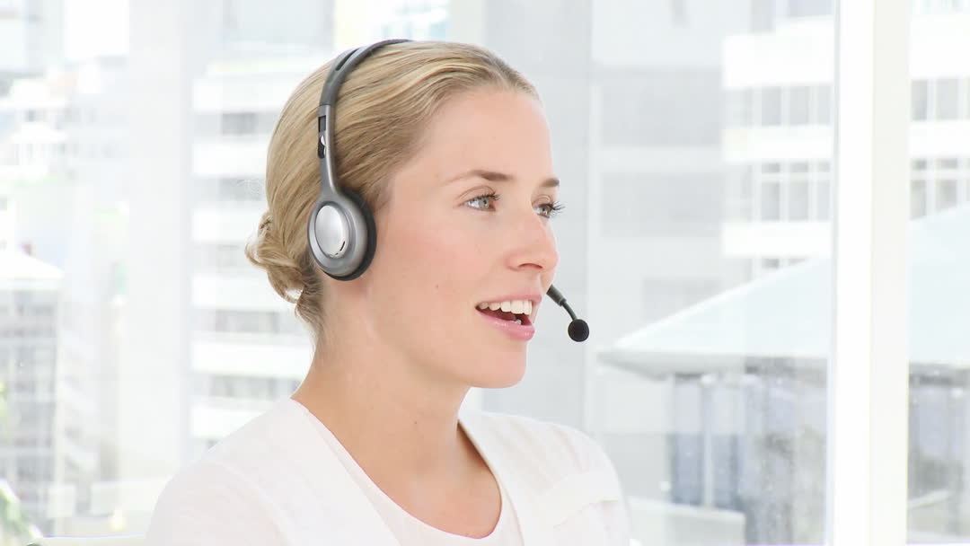 A woman with blonde hair is using a headset in a bright and modern office space. Suggests themes of communication, professionalism, and customer service. Useful for projects related to call centers, support services, and business communication solutions.