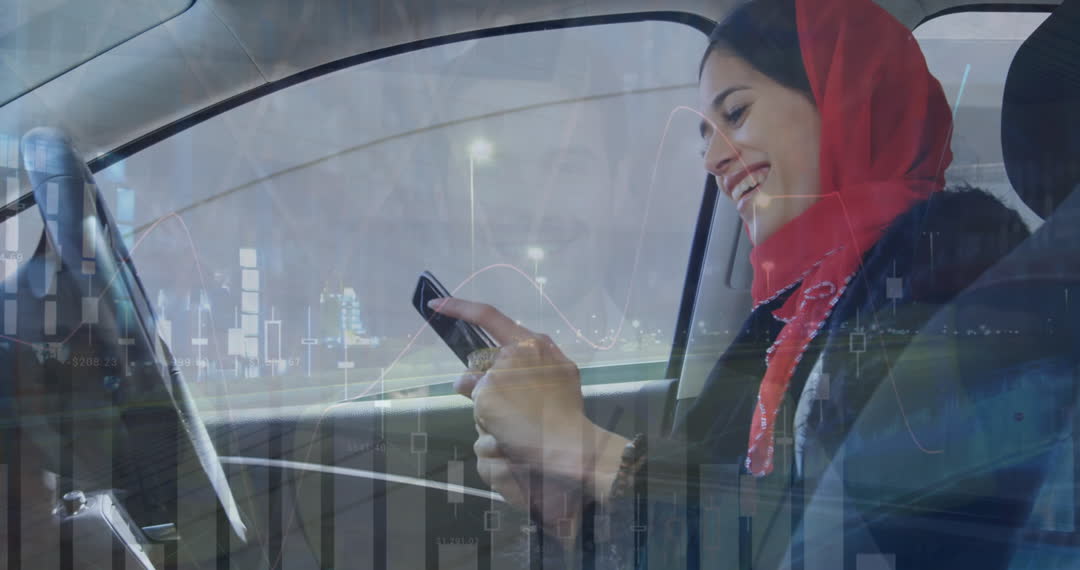 Image depicts a woman sitting in car using smartphone, overlaid with digital data visuals, ideal for illustrating concepts of digital connectivity, mobile technology in modern business, or finance and data analysis in advertising, editorial use, or tech-focused content.