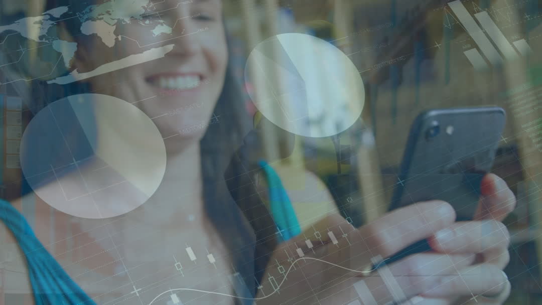 Smiling Woman Using Smartphone with Global Data Overlay Video