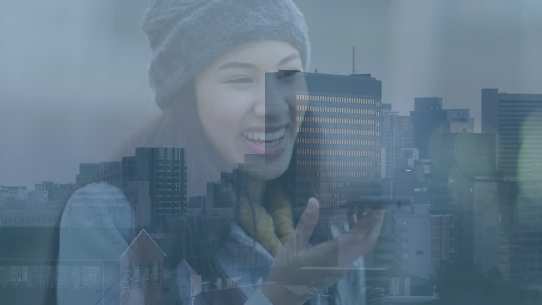 - Smiling Woman Using Smartphone with Modern Cityscape Overlay