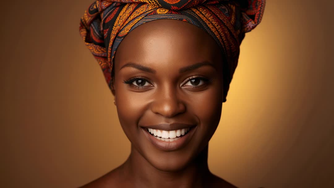 AI Generated Image. Featuring close-up footage of woman wearing colorful patterned headwrap, holding eye contact and widening smile against warm gradient backdrop. Studio lighting accentuating skin tone and toothy smile, creating welcoming and confident mood. Ideal for beauty and fashion commercials, cultural headwear campaigns, wellness and self-care promotions, dental and cosmetic advertising, social media profile reels, lifestyle b-roll, corporate diversity and inclusion content, editorial segments about style and heritage, tutorial intros and presentation openers. Pairing with upbeat music, natural warm color grading, and subtle motion graphics for title or logo reveal. Providing 15-30 second loopable clip for website hero, ad bumper, or social media story. Licensing note: model release recommended for commercial use.