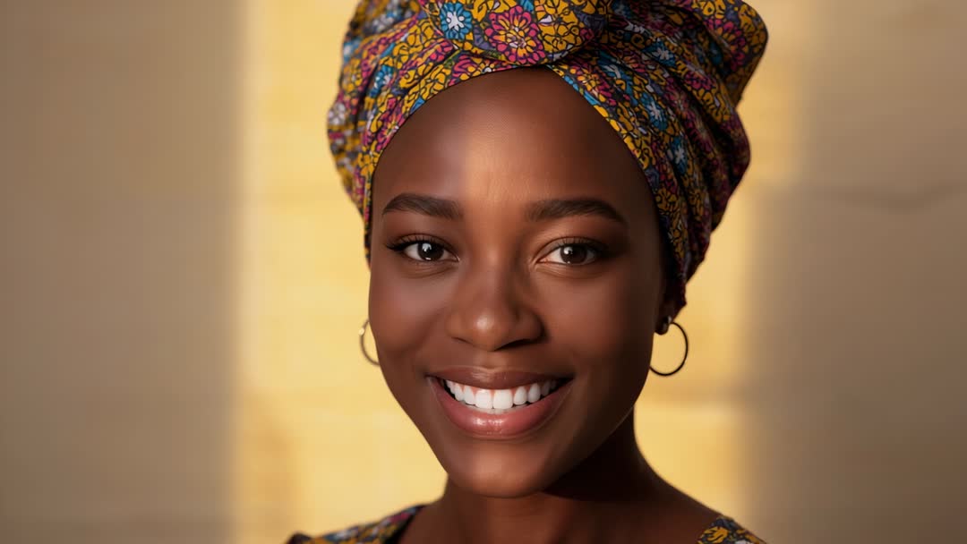 AI Generated Image. Close-up portrait video showcasing warm golden light on face, vibrant patterned headwrap, hoop earrings, centered composition, shallow depth of field, natural makeup, direct eye contact, radiant smile. Footage working well for beauty campaign, fashion editorial, social media content, e-commerce hero, profile video, diversity and inclusion storytelling, wellness and lifestyle branding. Use as hero clip for website or ad, as B-roll for interview or documentary, or as loop for shop banners and promotional spots. Colorful headwrap and warm tones supporting bold typography and product overlays. Delivering friendly, confident, modern vibe suitable for multicultural marketing and fashion storytelling.