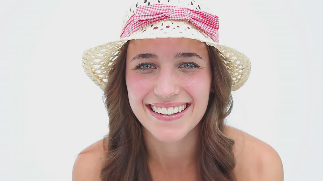 Smiling Woman with Straw Hat and Checkered Ribbon on White Background Video