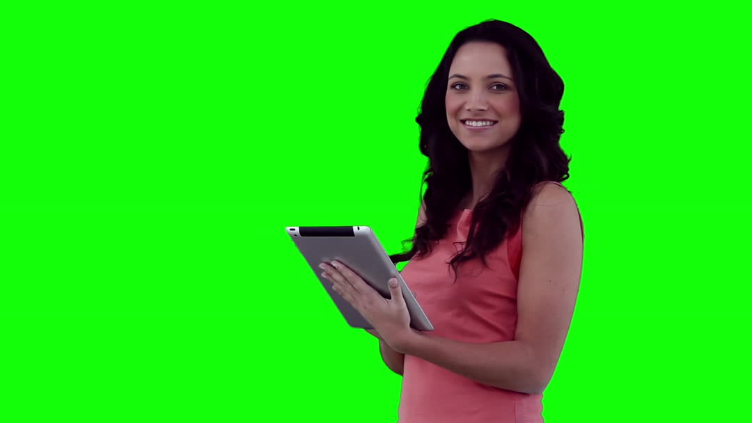 This captures a woman smiling at the camera while holding a tablet, set against a green screen background. Ideal for technology, business or educational concepts, it can be used in adverts demonstrating technology usage, online courses, or any digital communication themed materials.