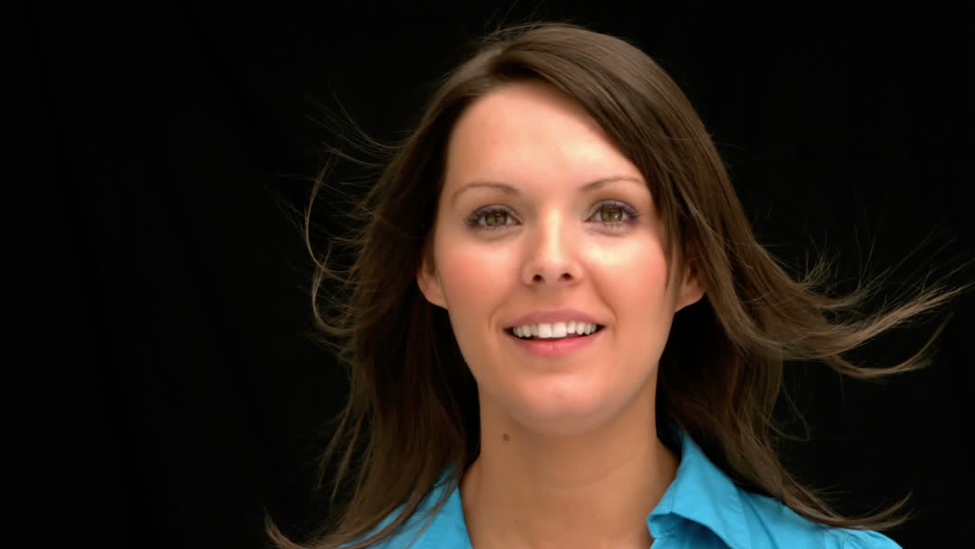 - Smiling Woman with Windswept Hair in Slow Motion Portrait