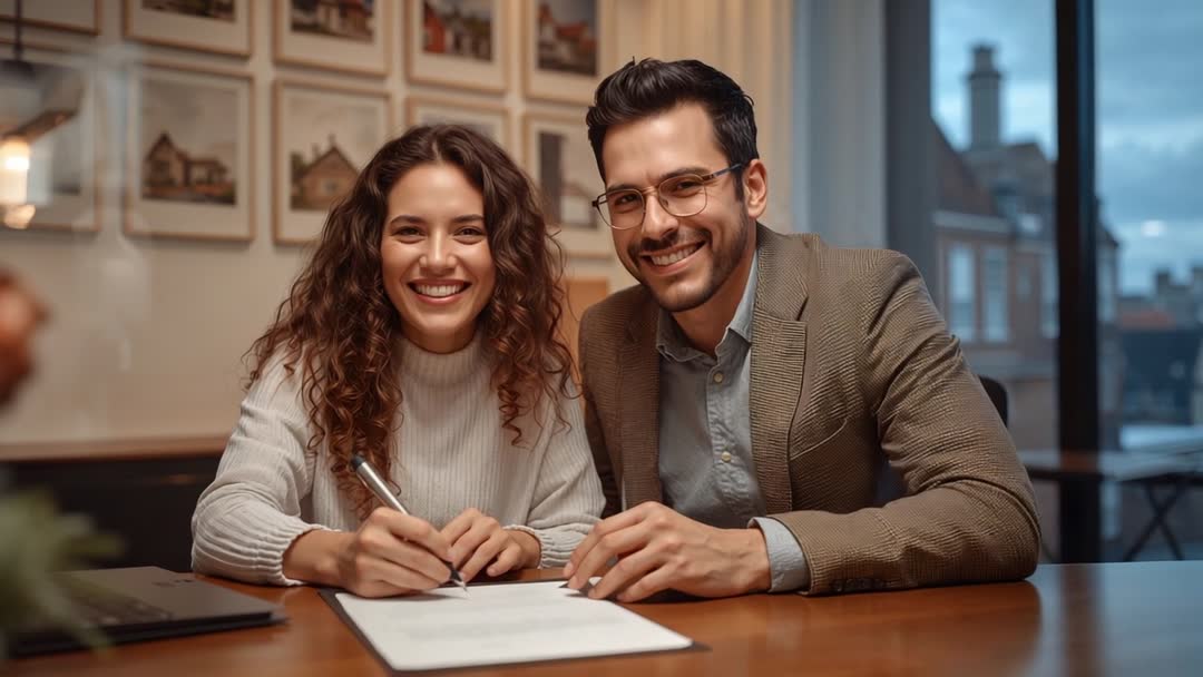 AI Generated Image. Featuring smiling young couple sitting at wooden desk and signing legal document together. Showing woman holding pen and signing paper while man leaning close and smiling at camera. Presenting framed artwork and city window at dusk in background. Casting warm, intimate light across faces and paperwork. Highlighting close-up moments for cutaways and reaction shots. Demonstrating real estate closing, mortgage approval, home purchase, legal consultation, financial planning, and small business partnership scenarios. Serving well for landing pages, social media ads, blog headers, client testimonial videos, corporate presentations, banner layouts, and editorial stories with space for headline overlay.
