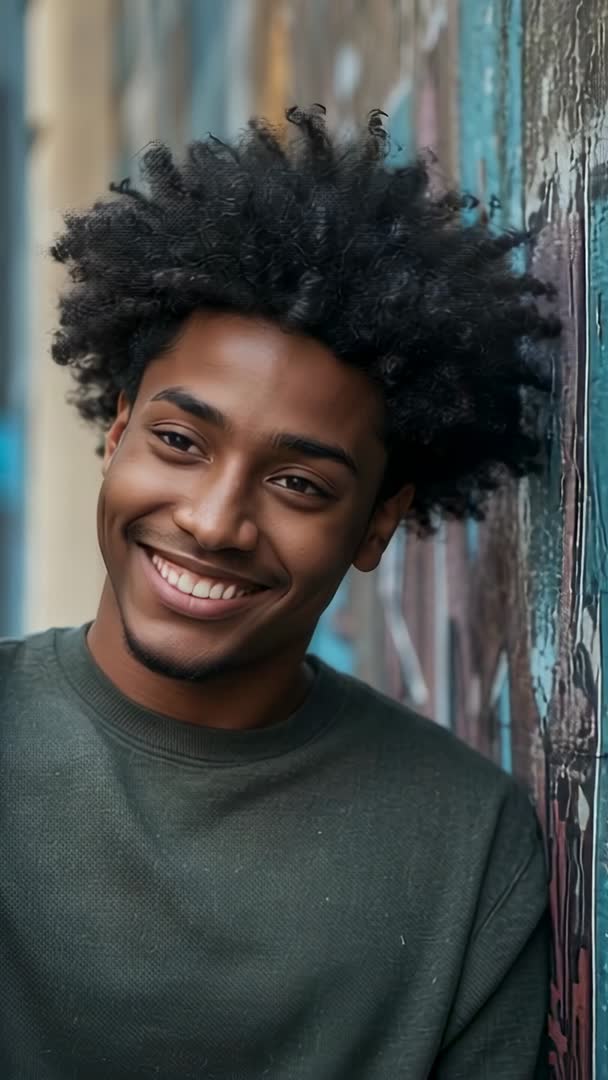 AI Generated Video. Smiling young man leaning against graffiti wall while reacting to offscreen video call. Vertical format capturing candid urban portrait with moody lighting and vibrant street art background. Serving as intro clip, profile reaction shot, B-roll for influencer videos, or banner for mobile-first campaigns. Ideal for social media content, lifestyle vlogs, dating app promos, telecommunications ads, and editorial features about city youth culture. Natural expression conveying friendliness, approachability, and authentic connection. Color grading options supporting warm or cool tones to match campaign mood.