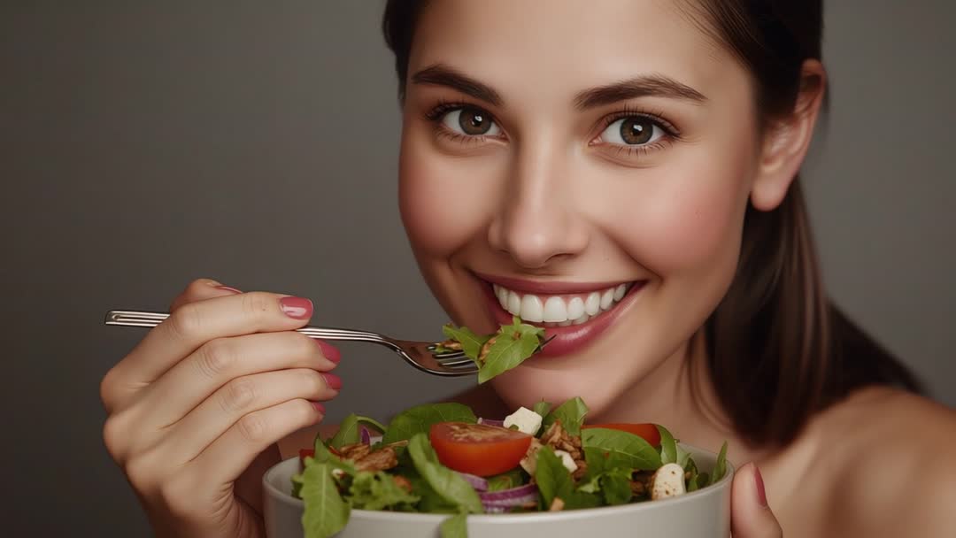 AI Generated Image. Showing young woman smiling while eating fresh salad and making direct eye contact with camera in studio closeup. Highlighting radiant skin, bright smile, and crisp salad ingredients such as lettuce, cherry tomatoes, red onion, and cubes of cheese. Featuring hand holding fork and bowl to convey approachable mealtime moment. Using warm studio lighting and shallow depth of field for polished, professional look. Perfect for promoting healthy eating on websites, social media, marketing campaigns, recipe pages, nutrition guides, dental care advertising, restaurant menus, and wellness presentations. Working well as short video loop for commercial projects, brand storytelling, app backgrounds, or editorial use focusing on lifestyle, nutrition, and self care topics.