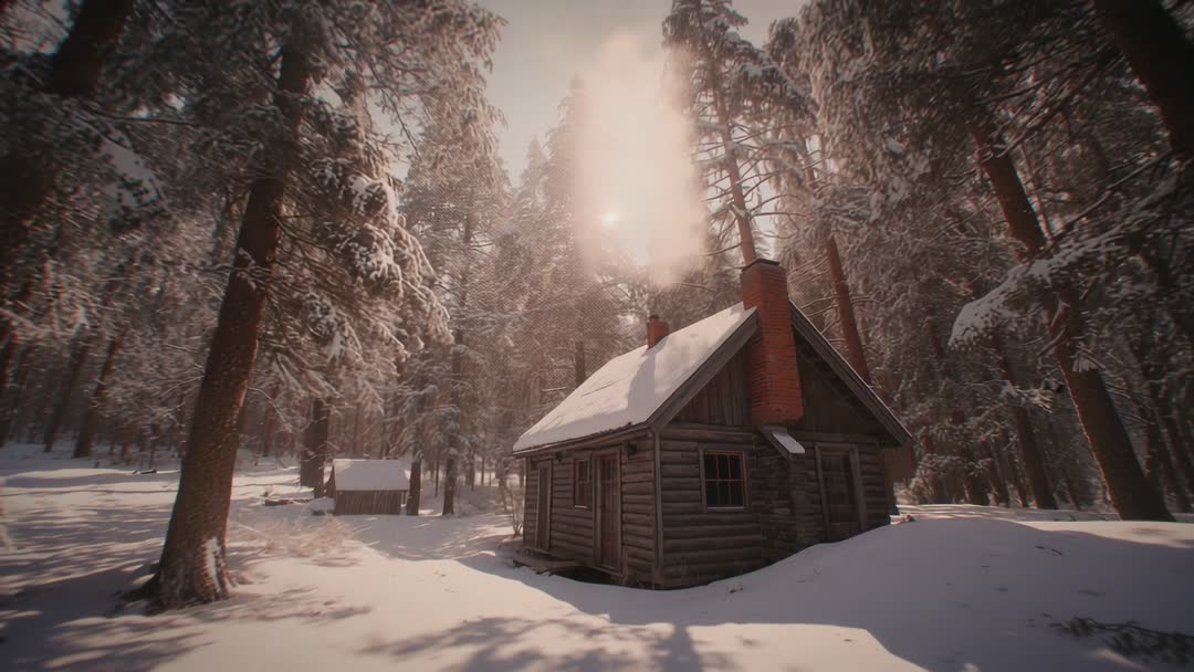 - Smoke Rising from Log Cabin in Winter Forest Wilderness