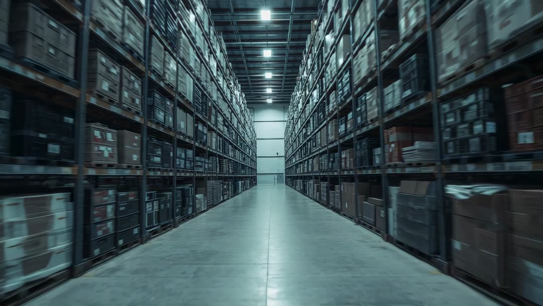 AI Generated Image. Long tracking shot showing symmetrical warehouse aisle lined with tall pallet racks and stacked cardboard boxes, lit by cool overhead LED lights and featuring subtle motion blur. Camera moving toward distant loading door, creating strong perspective lines and dramatic depth. Ideal for use as opener or b-roll in corporate logistics videos, ecommerce fulfillment promos, supply chain presentations, warehouse automation demos, industrial commercials, and training materials. Working well as background for website hero banners, social media ads, investor pitches, safety training modules, and inventory management tutorials. Technical details include cinematic framing with central vanishing point, wide-angle composition, even LED lighting, and neutral color palette with cool blue cast; suitable for 4K and slow-motion extraction. Editing suggestions include adding steady ambient soundscape, subtle whoosh transitions for motion continuity, or voiceover highlighting efficiency, throughput, and scalability.