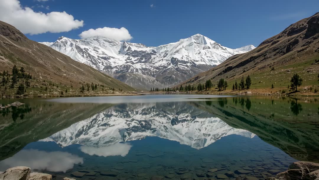 AI Generated Video. Video frame showing pristine snow-capped peaks reflecting on glassy alpine lake, breeze revealing shallow lakebed with visible stones and gentle ripples. Sloping valley and scattered conifers framing scene, clouds drifting over peaks and adding soft contrast against deep blue sky. Composition offering wide panoramic view with strong foreground interest and natural space for headline or lower third text overlay. Serving use for travel and adventure promos, outdoor gear advertising, ecotourism campaigns, landscape documentaries, wellness and meditation content, website hero banners, desktop wallpapers, social posts, calendars, and editorial spreads. Color grading suggestion: preserving cool mountain tones and enhancing midtone contrast to emphasize mirror reflection; suitable for widescreen video, cinematic sequences, and time-lapse projects capturing changing light.