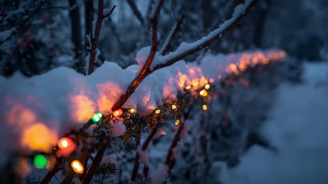 AI Generated Video. Footage showing snow-covered hedge lined with multicolor string lights glowing against deep blue dusk. Camera performing shallow focus pull along hedge, creating soft bokeh highlights and warm contrast between colorful bulbs and cool snow. Mood conveying cozy festive atmosphere suitable for holiday storytelling, seasonal intros, and commercial background loops. Use for website hero banners, social media reels, greeting card animations, TV spots, retail displays, event openers, and ambient looped backdrops. Footage working well with overlay text, slow motion, and subtle color grading to emphasize warm-versus-cool contrast.