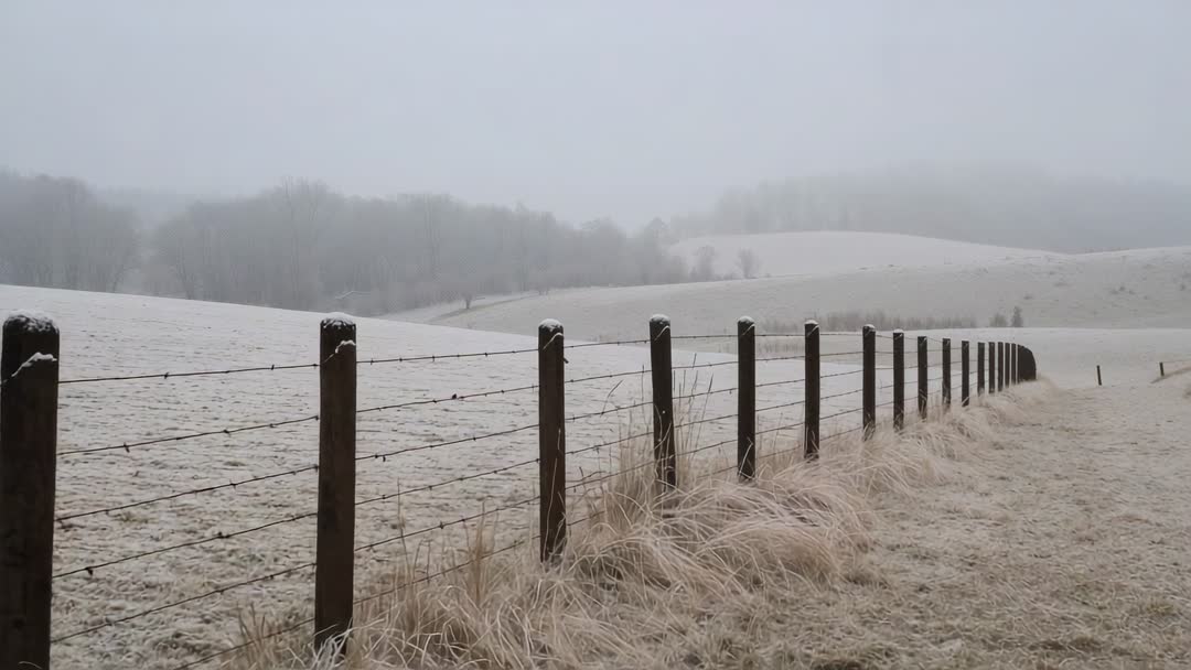 - Snow-dusted fence line leading through frosty pasture toward misty rolling hills