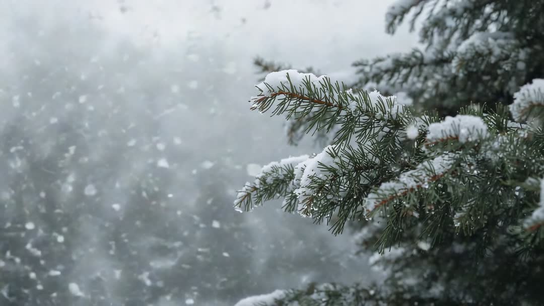 AI Generated Video. Video showing close-up of snow-dusted fir branches while snowflakes are falling, needles collecting powder, background fading into soft bokeh. Camera focusing on textures of evergreen needles and delicate flakes, motion creating calming rhythm. Muted color palette of greens and grays creating serene wintry mood. Ideal for seasonal projects, holiday greetings, weather reports, nature documentaries, website hero banners, social media reels, and calming background loops. Footage working well for product ads with winter themes, title sequences, and environmental storytelling. Available in slow motion and loopable versions for extended use.