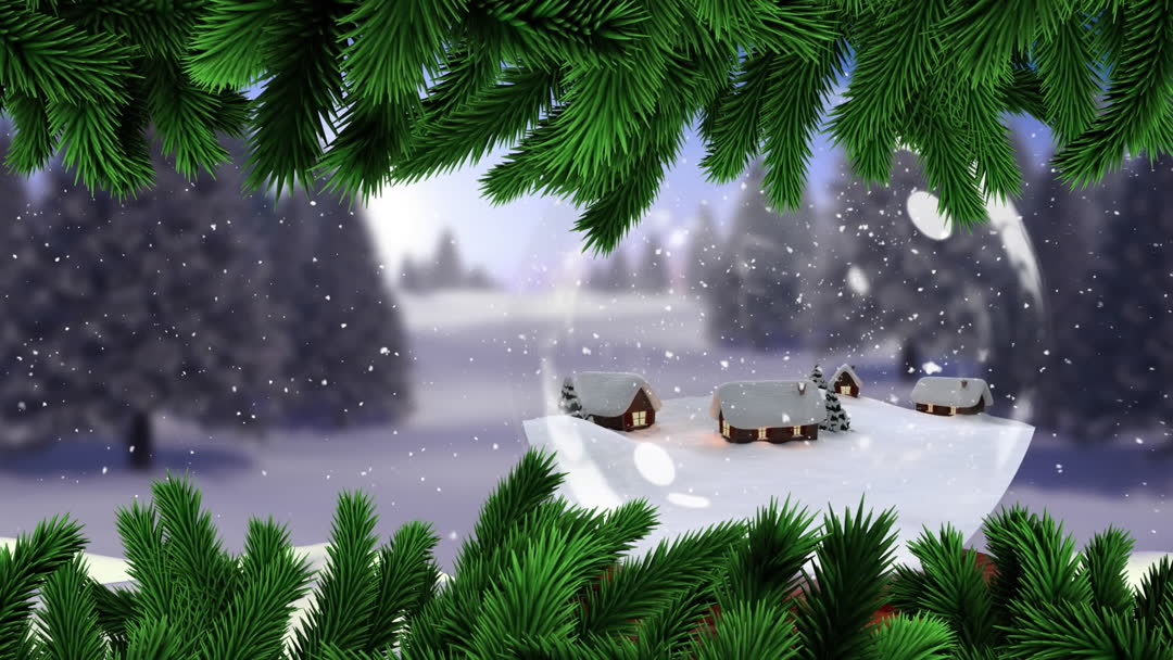 Charming scene depicting small cottages nestled in a snow globe set against a picturesque winter landscape with flowing snow and surrounding green branches. Perfect for festive branding materials, holiday greeting cards, or winter-themed promotional campaigns to evoke a sense of warmth and seasonal joy.