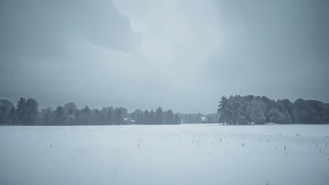 AI Generated Video. Snow falling over wide snow-covered meadow while low clouds hovering above distant tree line and scattered cabins. Pine and deciduous trees lining horizon, branches dusting with fresh snow, muted blue-gray palette creating calm, moody atmosphere. Wide panoramic framing with large negative space making ideal background for text overlays, lower thirds, or title sequences. Use for winter travel promos, seasonal commercials, holiday greeting videos, relaxation and meditation content, weather reports, nature documentaries, cabin or real estate marketing, social media posts, website banners. Consider looping short segment for ambient backgrounds, adding soft wind and subtle falling-snow sound effects, and gentle color grading to enhance cold tones.