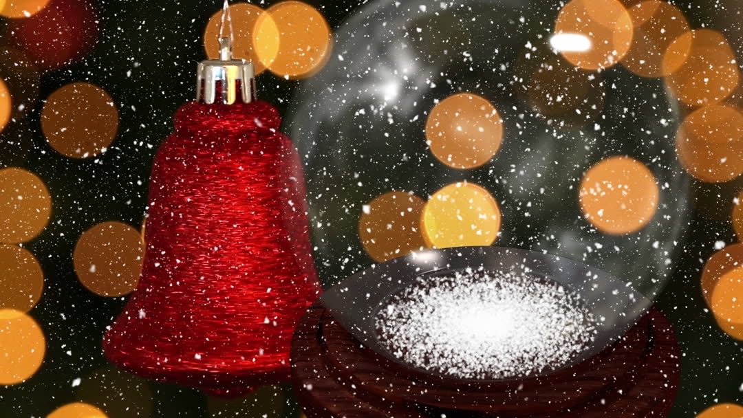 Festive animation features snowfall over a glowing Christmas globe and bell ornament, creating a warm holiday atmosphere. Ideal for holiday greeting cards, festive social media posts, or decorating videos focusing on Christmas traditions and celebrations.