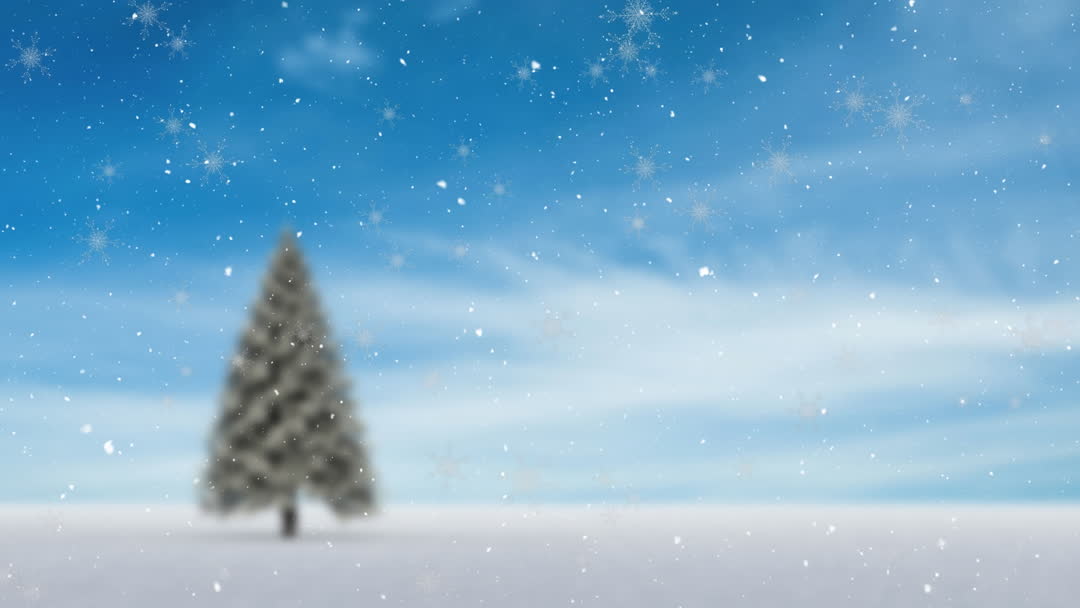 Serene and atmospheric, this animated illustration captures the falling snow against a winter landscape. Blurred Christmas tree and softly falling flakes add to the sense of tranquility. Ideal for use in holiday greetings, seasonal promotions, or background visuals promoting festive spirit.