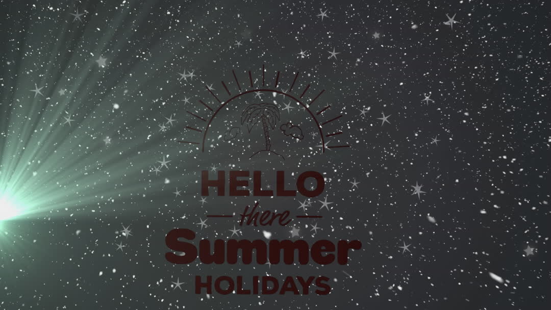Winter snowfall animation on dark background with summer holiday message combines winter and summer themes. Suitable for festive greeting contexts, unique holiday marketing content, or creative design projects exploring seasonal contrasts.