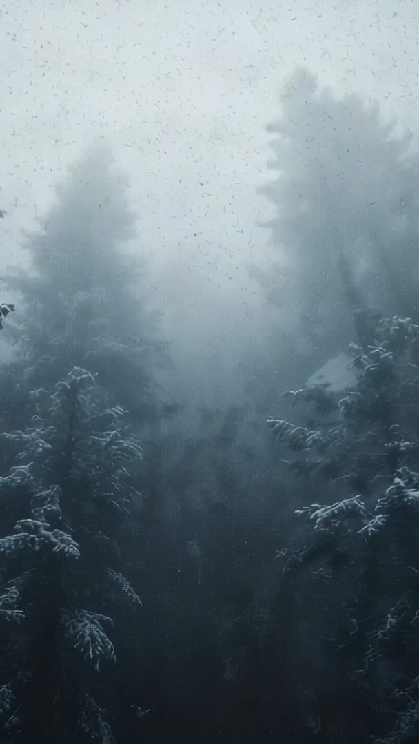 Snowfall Drifting Through Misty Evergreen Forest Vertical Winter Conifer Canopy Video