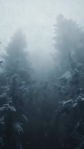 - Snowfall Drifting Through Misty Evergreen Forest Vertical Winter Conifer Canopy