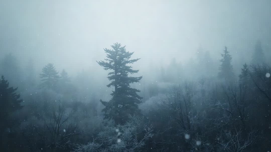 AI Generated Image. Misty winter scene showing towering conifer silhouette with soft snow flurries drifting through dense fog. Wide cinematic composition with central tree anchor and layered depth from receding treeline. Cold blue tones and gentle motion evoking calm, solitude, mystery. Useful for title sequences, background loops, nature documentaries, meditation apps, seasonal commercials, book covers, social posts and website hero backgrounds. Suitable as atmospheric opener for film or TV, ambient background for presentations, or layered under voiceover for weather and environmental storytelling. Recommended production uses: slow crossfade or gentle zoom, subtle color grading to enhance blue mood, optional soft piano or ambient pad soundtrack. Deliverable suggestions: widescreen formats, loopable cuts, and slow-motion variants for extended ambient use.